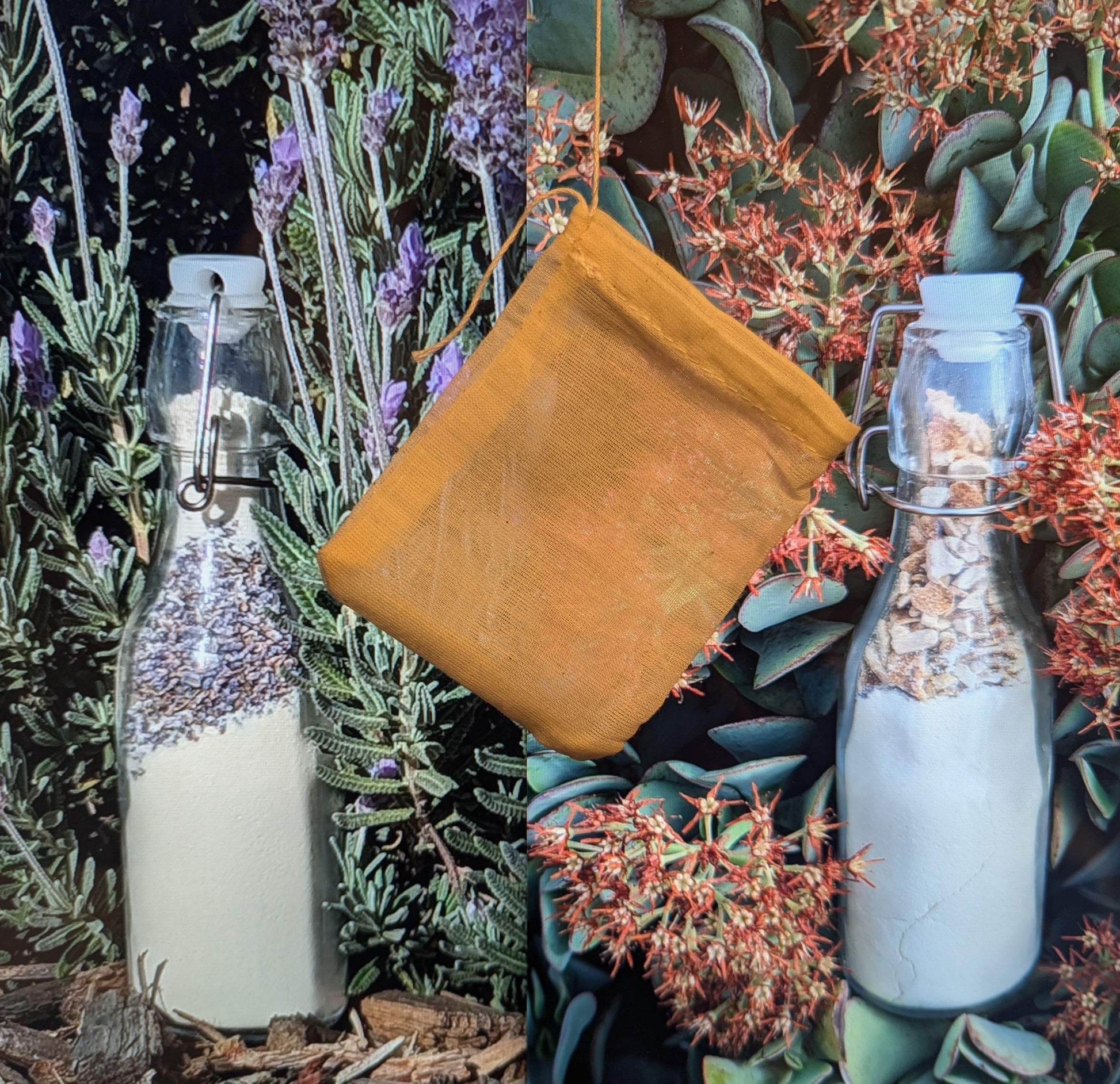 This cotton drawstring bag can be used to catch all the botanicals but still release the bath-milk into your tub!